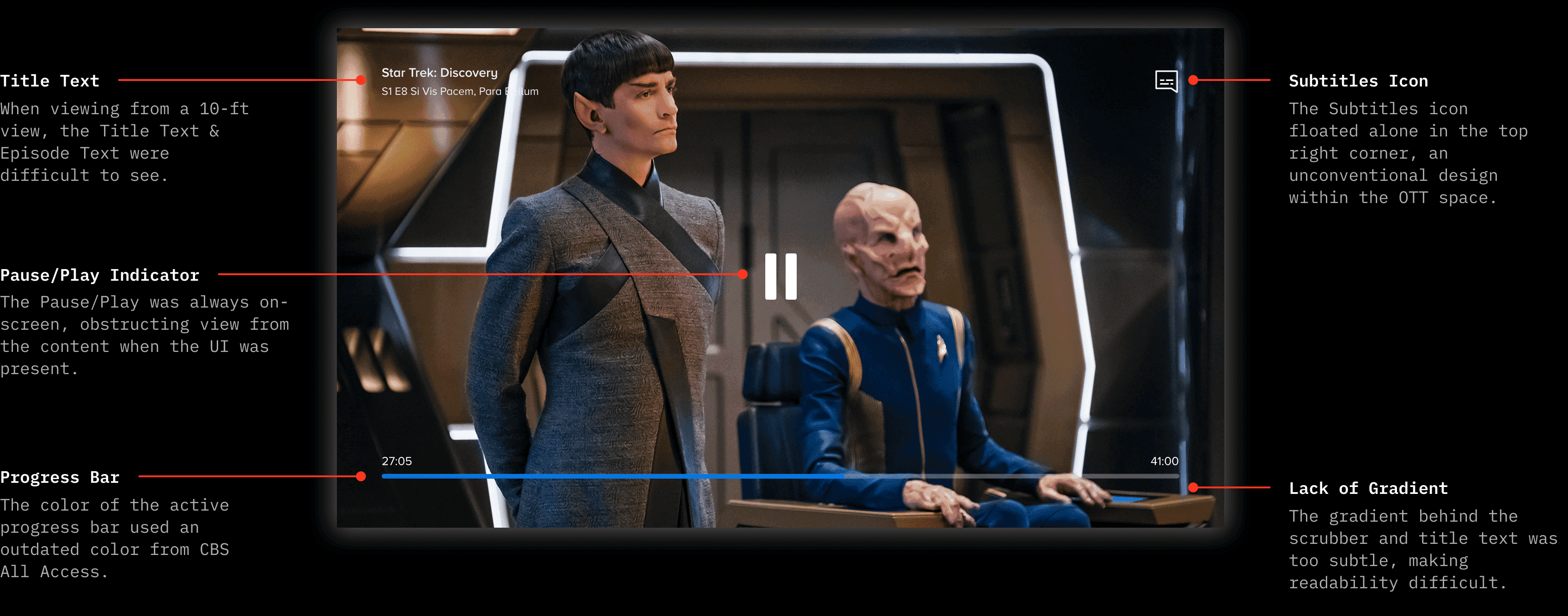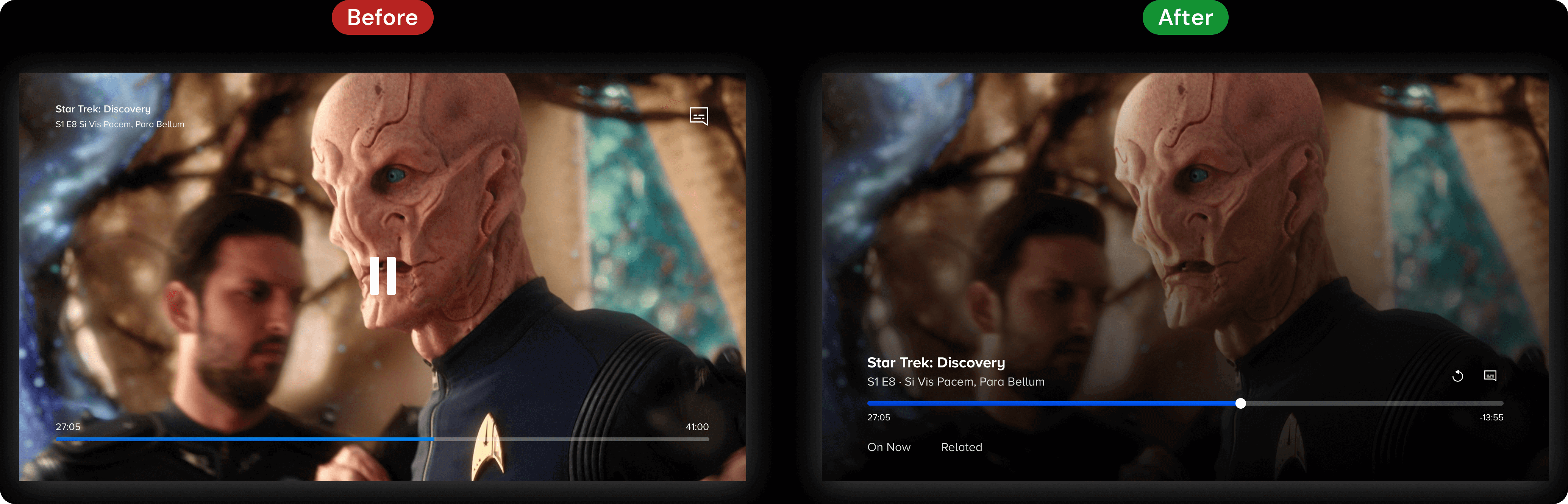In the old design, controls were scattered across all four corners of the screen, which obstructed the content and made the interface difficult to parse at a glance. The layout also created unintuitive associations: playback controls originated from the pause button rather than the scrubber bar.