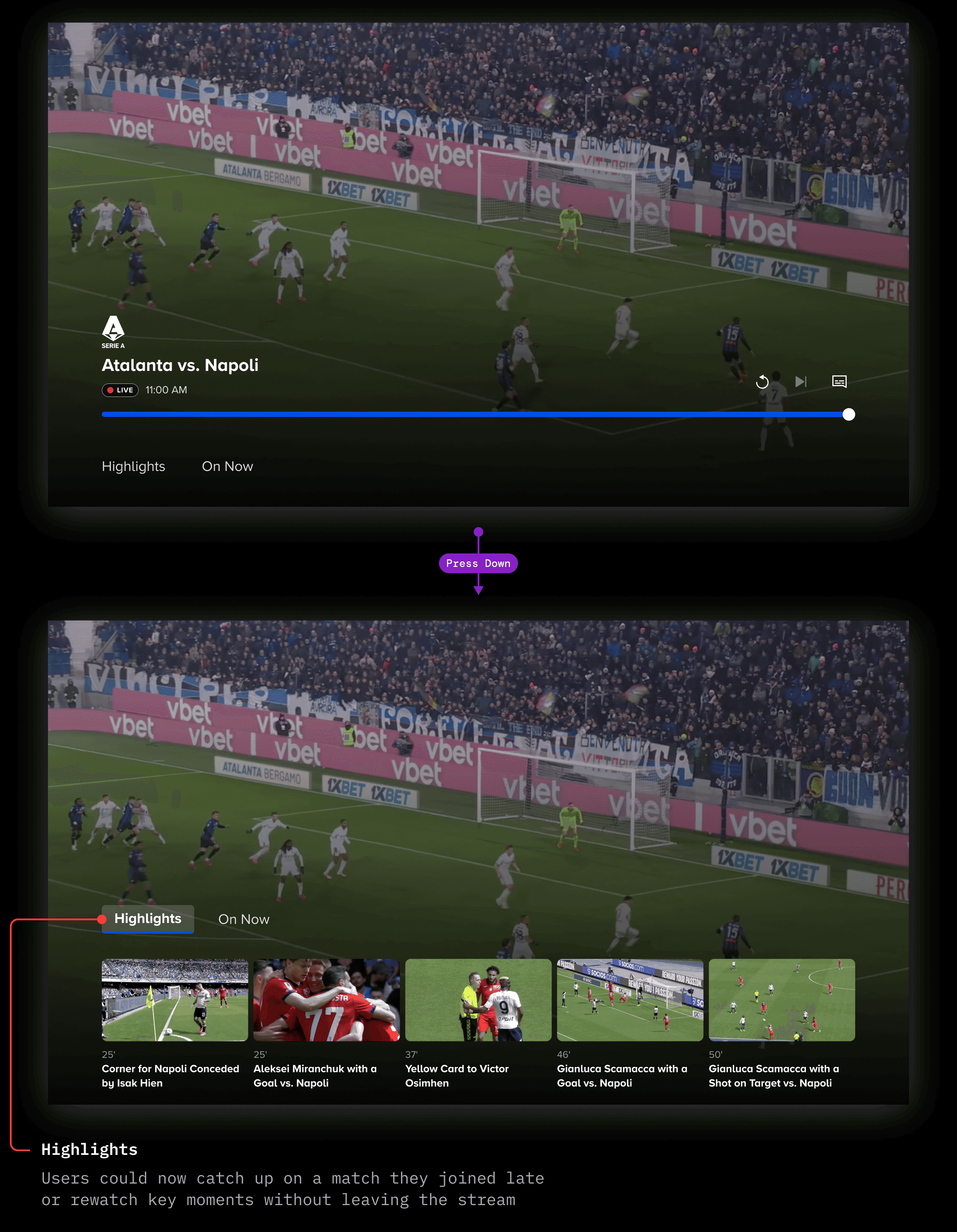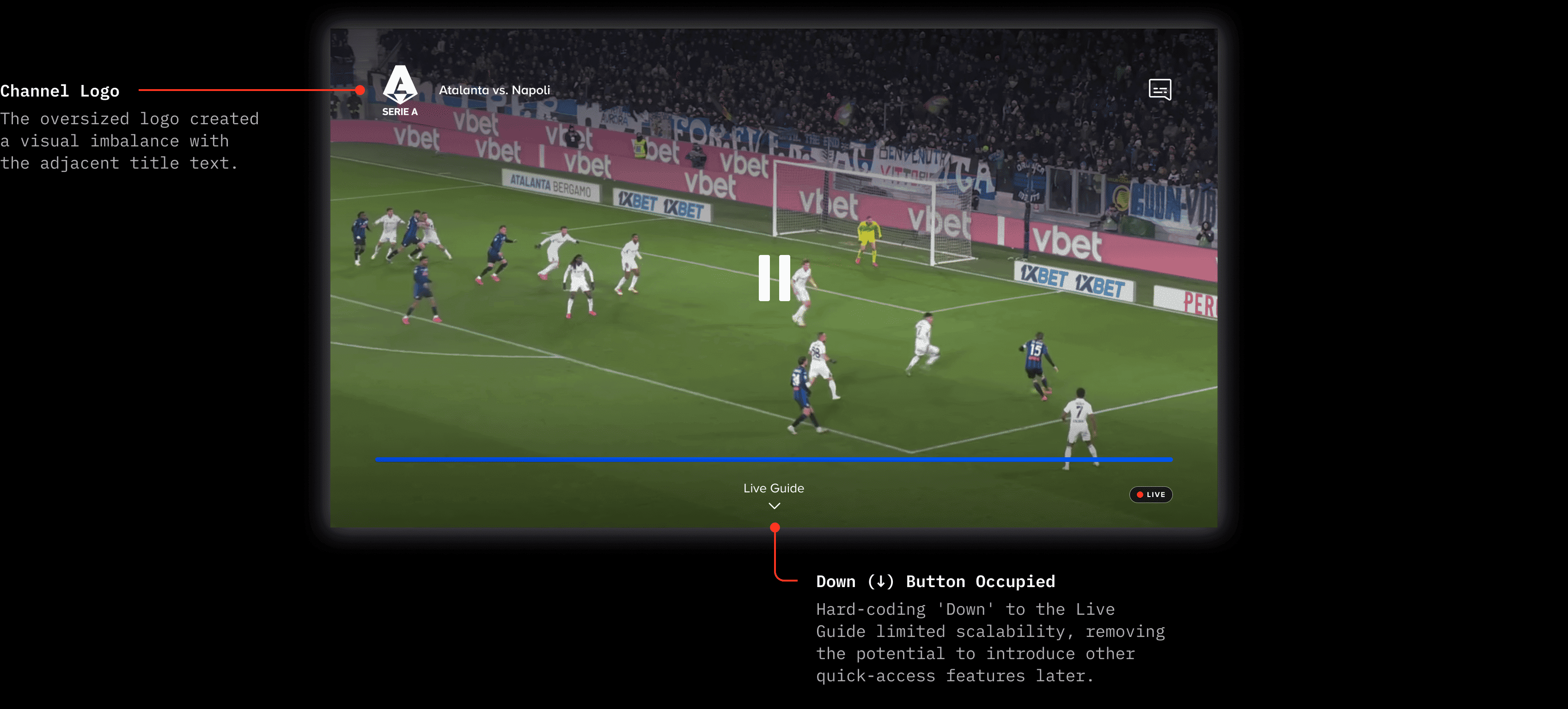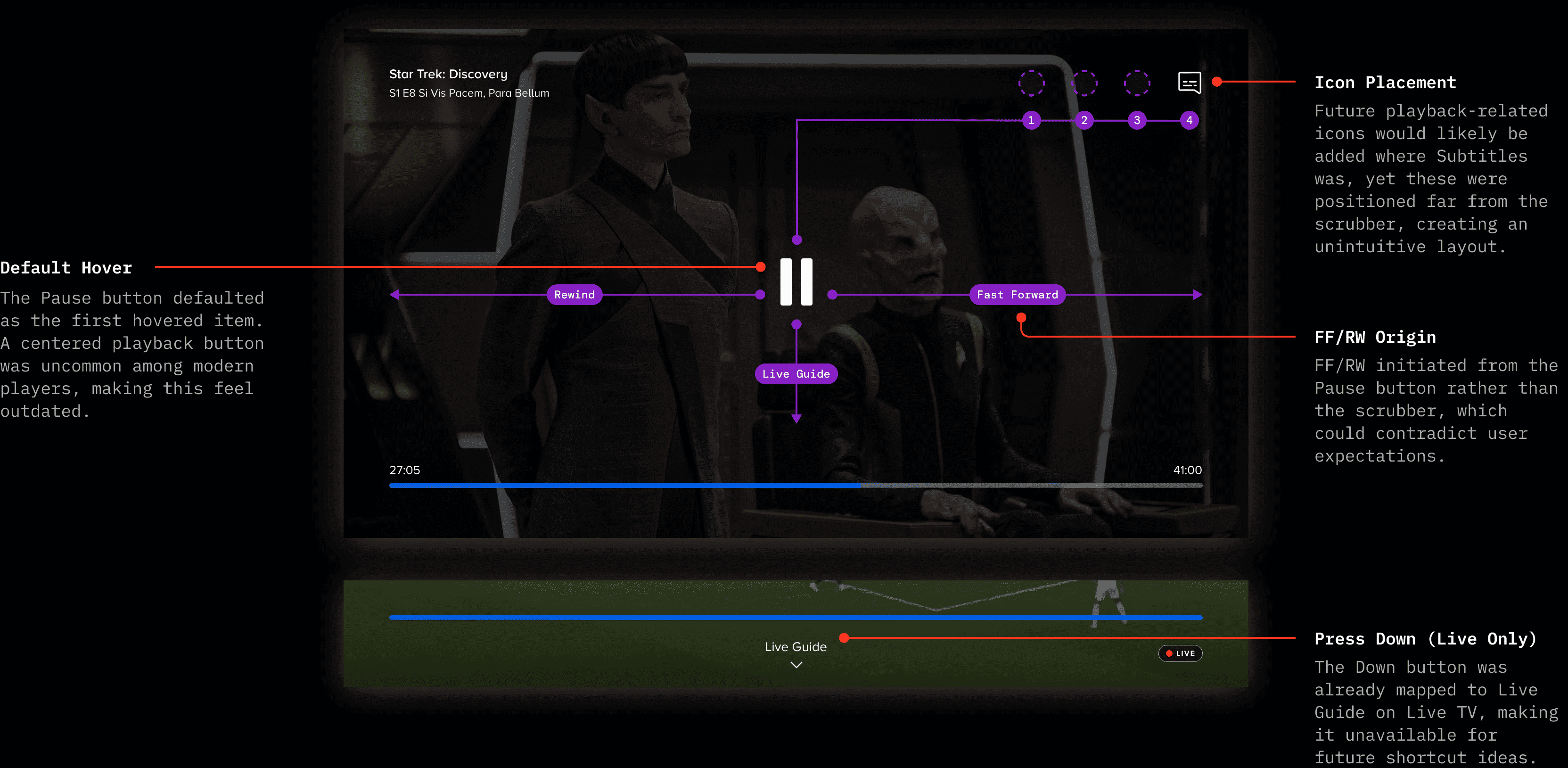 My job was to find a navigation model that could serve both VOD and Live contexts, while also accommodating the distinct needs of each (like live sporting events) and introducing content discovery, without disrupting the core viewing experience.