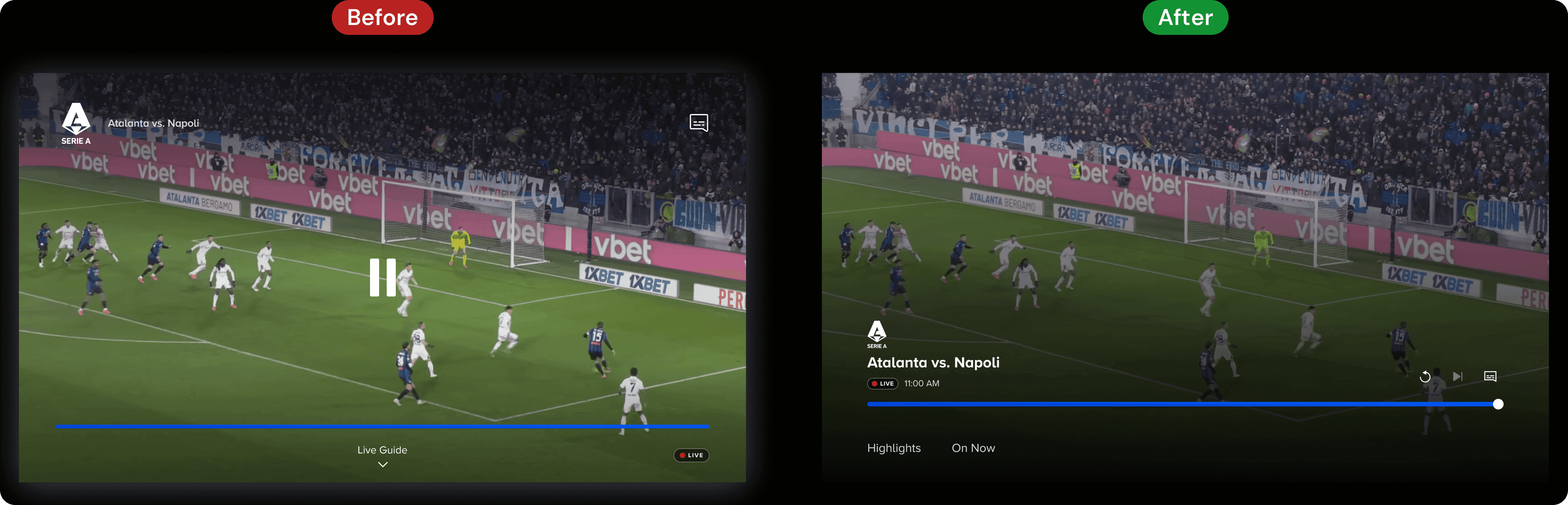 The team used the new architecture to ship features like Sports Highlights and HDR/SDR video quality toggles for NFL streams — features that would have been difficult to implement in the old design. The consolidated bottom-region layout I established gave future designers a clear, scalable canvas to build on without having to re-design where controls should live.