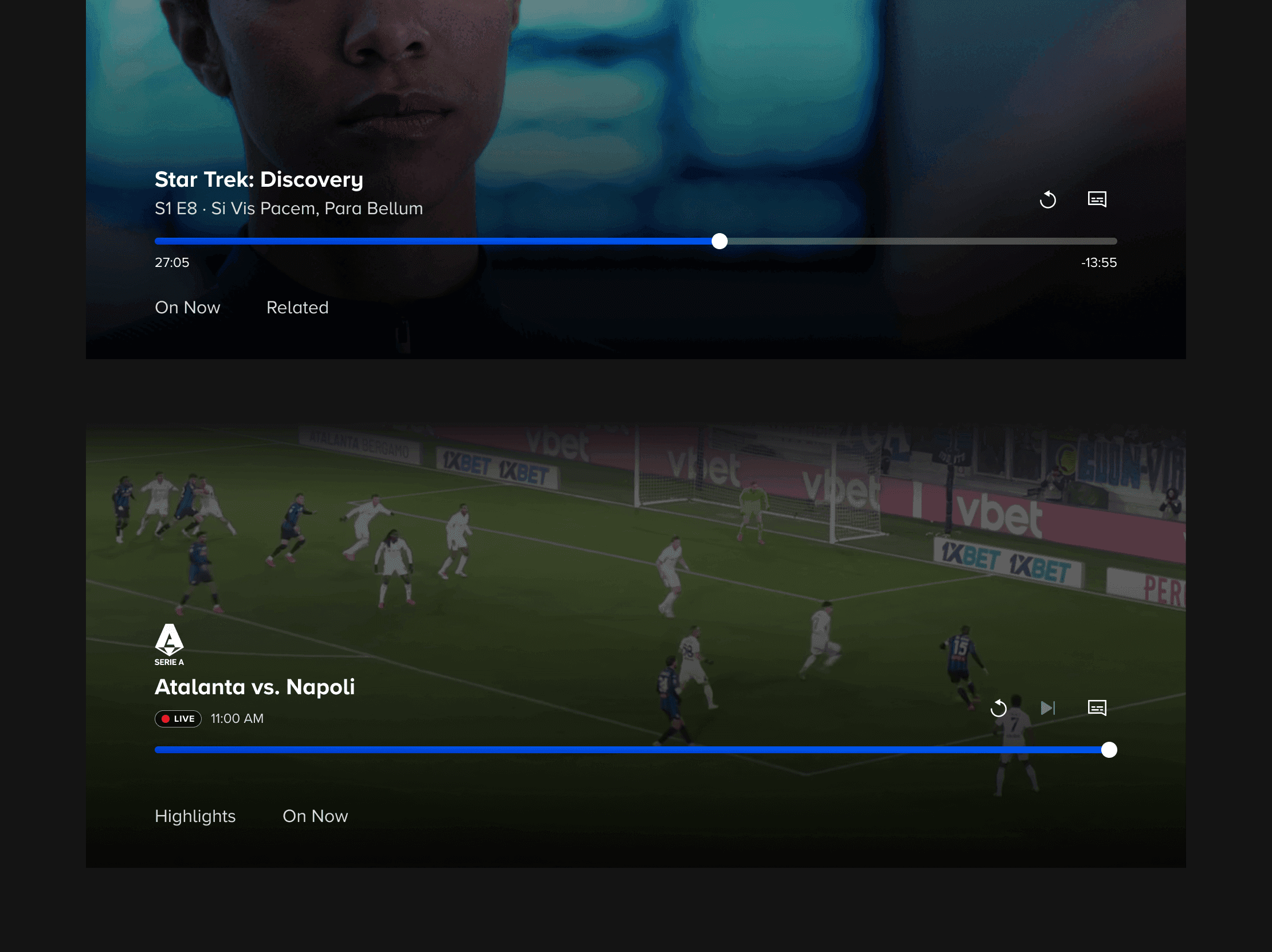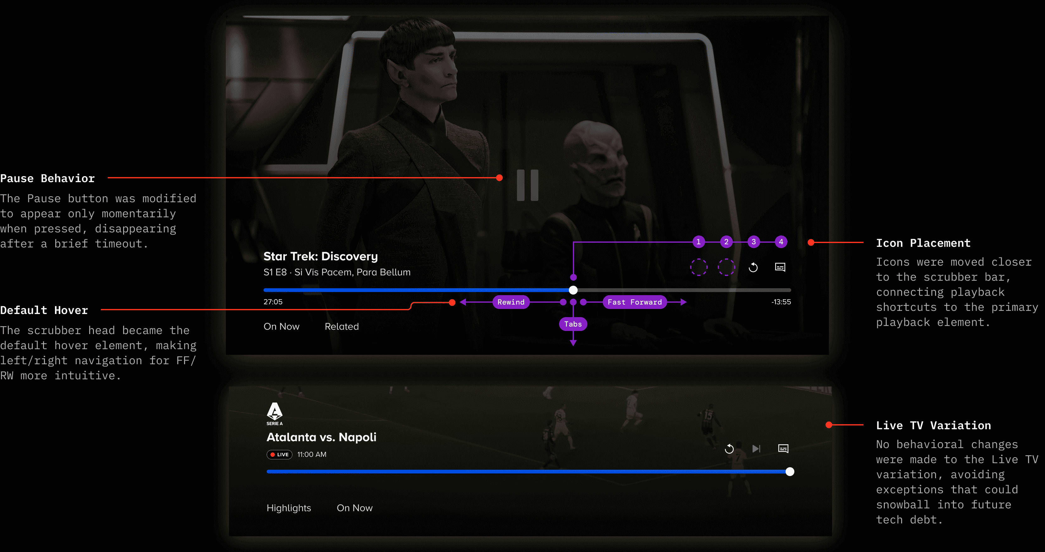 The new TV video player unifies VOD and Live playback under a single interaction model, while continuing to accommodate the slight variations needed for specific, limited-time Live events.
