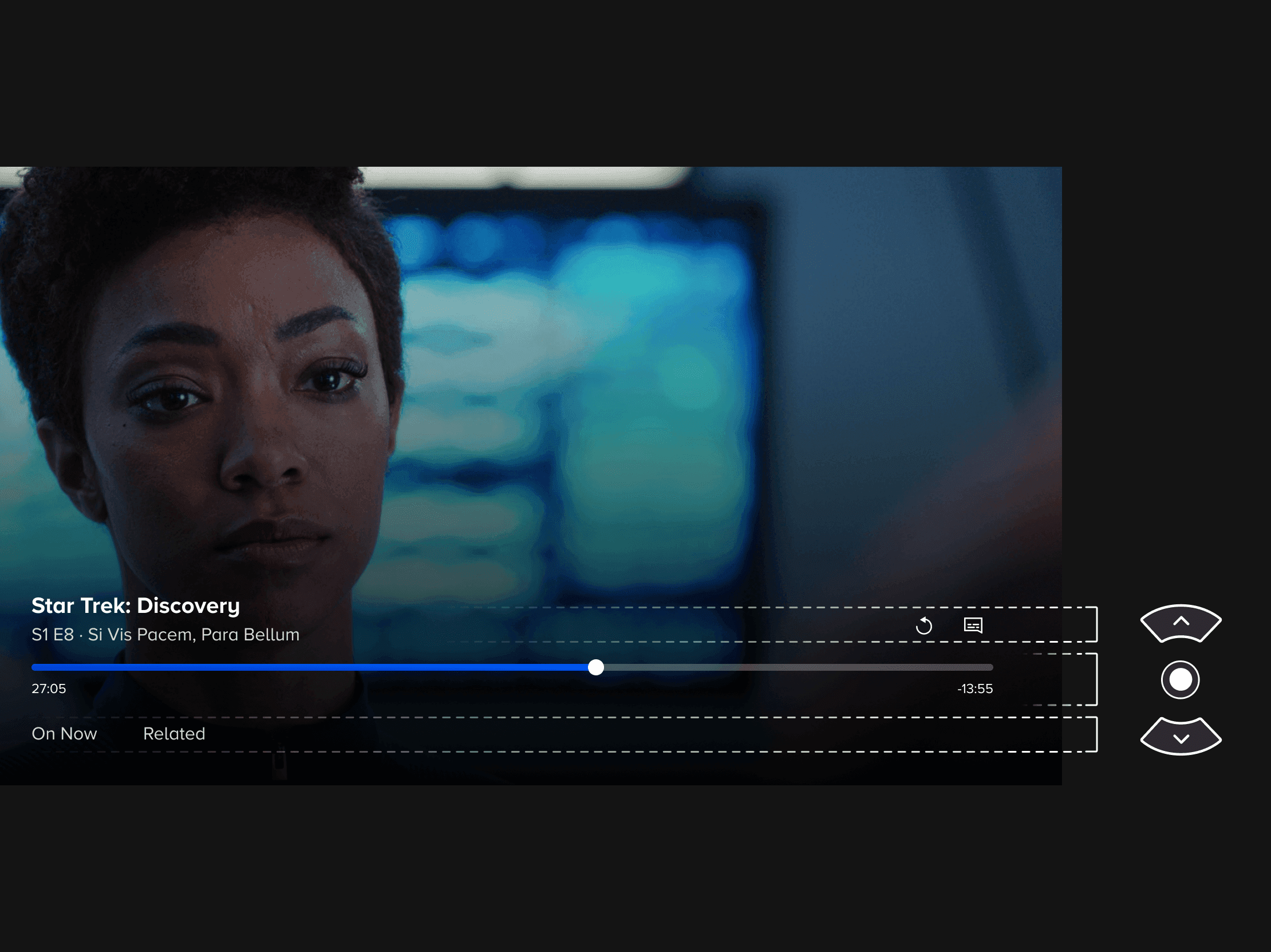 Participants found the consolidated control layout easy to navigate using their remote. The bottom-region structure let users quickly access playback controls, browse discovery content, and jump between episodes without losing their place.